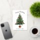 Tarjetas de papel de aluminio rosa dorado navideño de árbol de Navidad de pino. Un árbol de Navidad en una maceta y texto Feliz Navidad. Agregue el nombre de su familia y su texto en el reverso.