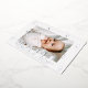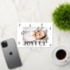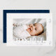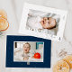 Tarjeta de Navidades fotográficos festivos con su foto horizontal rodeada de pinos de Relieve metalizado plateado hechos a mano con un fondo blanco. "Alegre" se muestra en negrita con letras de Relieve metalizado plateado con el saludo de su personalizado y el nombre de la familia que se muestra a continuación. La alegre tarjeta de Navidades se revierte para mostrar una foto adicional y un fondo marino con sutiles puntos blancos.