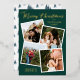 Un verde verde azulado oscuro sólido con el texto de Relieve metalizado dorado "Feliz Navidad" cuatro fotos enmarcadas de diseño de vacaciones de collage. En la parte posterior se muestra un patrón repetido de árboles de color verde eterno sobre un fondo blanco. Simplemente agrega tu apellido y el año junto con tus fotos para completar el diseño. Diseño compuesto por Holiday Hearts Designs (derechos reservados) con fotos de marcadores de posición de plantilla cortesía de varios fotógrafos a través de Unsplash.