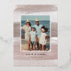 La tarjeta de vacaciones de estilo costero de moda añade un toque náutico a tus saludos navideños. Perfecto para compartir una foto de vacaciones, o para familias que viven en lugares costeros, tropicales, cálidos o isleños, este elegante diseño presenta su foto favorita sobre un fondo de franjas acuáticas de color marrón y rosa, con una salpicadura de Relieve metalizado oro rosa en la parte superior e inferior. Añada su mensaje de vacaciones personalizado (que se muestra con "mares y saludos") y sus nombres o apellidos. Personalice la parte posterior con tres fotos adicionales.