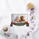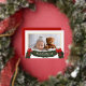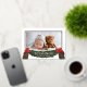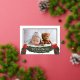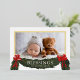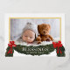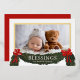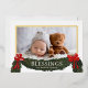 Dulce saludo de Navidad que presenta una foto y una guirnalda de vegetación festiva con hermosos lazos rojos. "Bendiciones" y su nombre están en hermoso texto de lámina de oro real. La parte posterior es roja clásica e incluye una guirnalda festiva con el año.