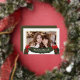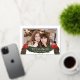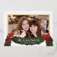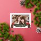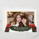 Dulce saludo de Navidad que incluye una foto y un ramo de vegetación festiva con lazos rojos bonitos. "Bendiciones" inspiradoras y su nombre están en hermoso texto de lámina dorada real. La parte trasera es de un verde clásico y cuenta con una guirnalda festiva con el año.