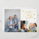 Tarjeta personalizada alegre y brillante con foil dorado. El diseño presenta un fondo blanco simple con 3 fotos de retrato en la parte delantera y una foto de paisaje en la parte posterior. La parte delantera de la tarjeta presenta el nombre de la familia y el año.