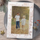 Tarjetas de Navidad elegantes con tu foto vertical en un marco botánico. Fondo blanco con acentos de rosa oro metálico. El reverso es un rojo oscuro festivo. ¡Los mejores deseos!