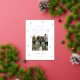 Un diseño de tarjetas de vacaciones Navidades moderno y elegante con una sola foto vertical sobre un fondo blanco salpicado de pinos Relieve metalizado dorados. Personalice con su saludo de vacaciones personalizado, su nombre de familia y el año por debajo.