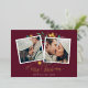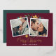 Elegante y festiva tarjeta fotográfica navideña encuadra dos de tus fotos cuadradas favoritas con un sutil borde de borde enredado y follaje de vacaciones verdes asomándose a las esquinas. Las flores y las bayas de la possettia de Relieve metalizado dorado completan el diseño. "Feliz Navidad" aparece al final en el guión de caligrafía de Relieve metalizado, con sus nombres debajo.
