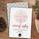 Un aspecto moderno para una tarjeta de vacaciones corporativa. Un enorme copo de nieve y "los deseos más cálidos" en Relieve metalizado de oro rosa. Un saludo de vacaciones que se puede usar para cualquier corporación. Un diseño de negocios elegante con un patrón de rayas finas en la parte trasera.