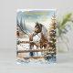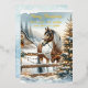 Tarjeta de foil de golf de Navidad con tema de granja festiva. Un bonito caballo marrón y blanco parado detrás de una vieja cerca de madera rústica con un fondo nevado y árbol de Navidad y antiguo granero rojo vintage.