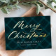Elegante tarjeta de vacaciones con "Feliz Navidad" exhibida en un guión de caligrafía de Relieve metalizado dorado sobre un fondo de manto verde azulado pintado. Personalice la parte delantera de la rústica tarjeta de vacaciones sin foto añadiendo su nombre y el año. La parte posterior de la tarjeta presenta un fondo de manchas a juego con sutiles puntos blancos de nieve.