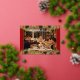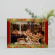 Único, clásico, trendy, bonito y decorativo Tarjeta de vacaciones. Texto de felicitación de Felices Fiestas y espacio para personalizar o personalizar con una foto y el nombre de la familia (o nombres individuales) y mensaje de su elección, enmarcado por un patrón de corona de piñas, agujas de pino y bayas rojas sobre un fondo de color rojo oscuro clásico. Y un poema de salutación de temporada personalizable en la parte posterior de la tarjeta.