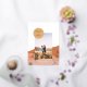 A modern and minimalist landscape design with terracotta and clay colored mountains and a golden yellow sun behind a personalized photo, holiday greeting and real gold foil cactus designs.