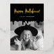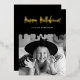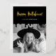 Fotos espeluznantes de Halloween mostrando "Halloween feliz" con letras de Relieve metalizado dorado. La parte superior del diseño incluye chorros de sangre negra en la foto que se muestra debajo. Personaliza el frente de la sangrienta tarjeta de Halloween con tu nombre. La parte posterior de la tarjeta tiene un fondo negro moteado.