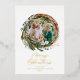 El follaje moderno era una tarjeta de Navidades navideños con escritura Feliz Navidad. El eucalipto pintado a mano, el follaje mínimo y la moderna corona rústica de mimbre junto con las letras de Relieve metalizado dan a esta tarjeta un ambiente lujoso. En verdes, marrones y grises elegantes.