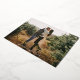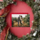 Tarjeta fotográfica navideña moderna con tu foto horizontal con "Feliz Navidad" mostrada en un guión de Relieve metalizado dorado. Personalice la parte delantera de la tarjeta de fotos de Navidad del Relieve metalizado con su nombre familiar y el año. La tarjeta se invierte para mostrar un patrón de nieve rojo y blanco.