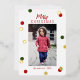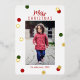 Tarjeta de felicitación moderna y personalizada de Feliz Navidad con fuente de caligrafía elegante y lámina de oro real, puntos verdes y rojos. Sube tu foto favorita.