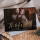 Envíe saludos de Año Nuevo con estas tarjetas de fotos de moda que incluyen el nombre de su familia en letras manuscritas de Relieve metalizado dorado. Personalice con su mensaje personalizado debajo. Las tarjetas revierten un patrón de pequeñas estrellas blancas.