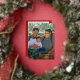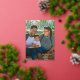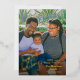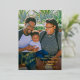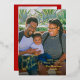 Tarjeta personalizada de felices fiestas con foil dorado. El diseño presenta 1 impresión de foto en toda la parte frontal y un collage de 3 fotos en la parte trasera. La parte frontal de la tarjeta cuenta con año personalizable, y un mensaje de ¡Feliz Año Nuevo! nombre de la familia y nombres individuales. La parte trasera de la tarjeta cuenta con un fondo rojo festivo.