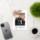 Elegante sencillez en este diseño de ramo de flores de color agua y berry con una cinta roja, tu foto y el saludo "Feliz Navidad". Simplemente agrega tu foto, tu nombre de familia y tu mensaje único detrás . El texto delantero y el contorno de la foto están en Relieve metalizado dorado. El texto de fondo es simplemente de color oro. Diseño compuesto por Holiday Hearts Designs (derechos reservados).