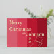 Este es un diseño elegante, Feliz Navidad con verdadera tipografía de Relieve metalizado dorado. Está en franjas rojas modernas y en escritura tipográfica de tendencia. Tiene el mensaje "Feliz Navidad de la Familia Johnson", con espacio para que añadas tu apellido y año de celebración. Perfecto para una tarjeta de Navidad familiar moderna y festiva. Para personalizar, simplemente añada tu nombre y año, usando el botón personalizar. Compruebe la herramienta de edición de diseño para cambiar el color o el tipo de letra. Si necesitas ayuda con la personalización, productos coincidentes o para un diseño personalizado, contacta conmigo a través de zazzle chat o email: ursuladawnmoon@gmail.com ¡Feliz Navidad!