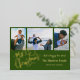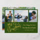 Tarjeta personalizada de Feliz Navidad con foil dorado. El diseño presenta 3 de tus fotos favoritas en la parte delantera y 1 foto impresa en toda la parte posterior. Y un mensaje de ¡Feliz Año Nuevo! es personalizable para que lo edites y lo hagas único. El nombre de la familia y los nombres individuales en tipografía dorada para que coincida con el foil dorado, el fondo verde festivo es personalizable y se puede cambiar a cualquier color. Feliz Navidad y un Feliz Año Nuevo de Suki's.