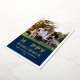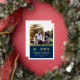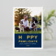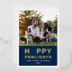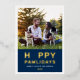 Una tarjeta de foto festiva para nuevas mascotas y amantes de las mascotas presenta una imagen favorita de su mejor amigo peludo con la moderna y divertida frase "Feliz Pawlidays" con impresión de lámina de oro real y un acento de huella de pata adorable. Personalice el texto blanco simple con el nombre de su cachorro, el nombre de la familia y el año. Una foto y texto adicionales opcionales pueden ser personalizados en la parte trasera de la tarjeta. El color de fondo azul marino en el frente puede ser personalizado.