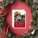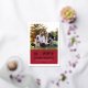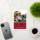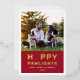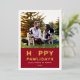 Una tarjeta de foto navideña festiva para nuevas mascotas y amantes de las mascotas presenta una imagen favorita de su(s) mejor(es) amigo(s) peludo(s) con una moderna y divertida frase "Feliz Pawlidays" con temática canina impresa en lámina de oro real con un acento de huella de pata lindo. Personalice el texto blanco simple con el nombre de su cachorro, el nombre de la familia y el año. Una imagen y texto opcionales adicionales pueden ser personalizados en la parte trasera de la tarjeta. El color de fondo rojo intenso en el frente se puede personalizar.