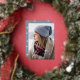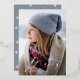 Tarjeta fotográfica de vacaciones moderna con "Merry" mostrado en un guión de Relieve metalizado de plata escrito a mano que domina tu foto vertical. Personalice la parte delantera de la tarjeta de fotos de Navidad con el nombre de su familia y el año. La tarjeta se revierte a un patrón de copos de nieve azul y blanco.