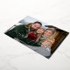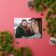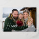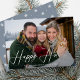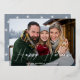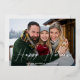 Tarjeta fotográfica navideña moderna con "Feliz feriado" mostrada en un guión de Relieve metalizado plateado escrito a mano que sobrepone tu foto horizontal. Personalice la parte delantera de la tarjeta de fotos de vacaciones de Relieve metalizado con su nombre familiar y el año. La tarjeta se revierte a un patrón de copos de nieve azul y blanco.