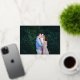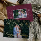 Un elegante y clásico diseño de tarjetas de vacaciones con una foto horizontal o orientada al paisaje, con un borde de copos de nieve de Relieve metalizado dorado en la parte superior. "Felices Fiestas" aparece en el guión tradicional de caligrafía. Personalice el nombre de su familia y el año con letras blancas en la parte inferior derecha, y añada una segunda foto en la parte posterior.