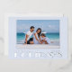 El auténtico papel de aluminio plateado bordea tu foto favorita y las palabras Felices Fiestas en letras elegantes de papel de aluminio plateado están en la parte delantera de estas tarjetas de felicitación de Navidad de color azul polvoriento y tu mensaje y nombres en la parte trasera. Asegúrate de verificar tu pedido antes de añadirlo al carrito, ya que lo que ves en la pantalla es lo que se imprimirá. El Servicio de Diseño en Vivo puede ayudarte con el diseño de tu tarjeta si es necesario.