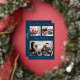 Elegantes Navidades modernos, azul marino y dorado saludo tarjeta de vacaciones de Relieve metalizado real con elegante tipografía con letras a mano Feliz Navidad. Esta tarjeta incluye 4 collage de fotos para ser reemplazados por los suyos. Puedes personalizar esta hermosa tarjeta con tu nombre y año de familia. Luces auténticas Navidades de oro de Relieve metalizado, falsas hojas botánicas de Relieve metalizado y color azul a la moda decoran el fondo.