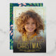 Un aspecto moderno para una tarjeta fotográfica de vacaciones. Una palabra de Relieve metalizado dorado - Feliz Navidad - está encima de la foto y saludo de feriado. En la parte posterior se incluyen hojas botánicas verdes y azules de colores.