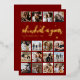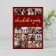 Tarjeta de Navidad moderna con un fondo blanco simple, un collage de 16 fotos de los preciosos recuerdos de su familia, la frase 'oh qué año' en lámina de oro real, copos de nieve, su nombre y el año.