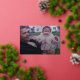 Un aspecto moderno para una tarjeta fotográfica de vacaciones. Una palabra de Relieve metalizado de oro - alegre - está encima de la foto y el saludo de feriado. Las hojas botánicas están incluidas en la parte posterior.