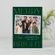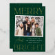 Tarjeta fotográfica de vacaciones moderna con tu foto horizontal bordeada por un marco fotográfico instantáneo blanco. La frase "Merry and Bright" se muestra en letras de Relieve metalizado dorado con un fondo festivo de color verde oscuro. Personalice la parte delantera de la tarjeta de Navidades de Relieve metalizado con el saludo de su personalizado, el nombre de su familia y el año con letras blancas. La tarjeta se revierte a un fondo verde con puntos blancos sutiles (nieve).