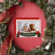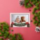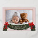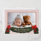 Tarjeta de felicitación de Navidad con tono rosa suave que incluye una foto y un adorno de vegetación navideña con lazos rojos. "Bendiciones" inspiradoras y su nombre están en texto de lámina real. La parte trasera es de color rojo clásico y cuenta con una corona festiva con el año.