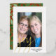 Bandas doradas y hojas botánicas verdes y bayas - Un aspecto moderno para una tarjeta fotográfica de vacaciones. Una palabra de Relieve metalizado dorado - alegría - está encima de la foto y saludo de feriado. Añade una foto vertical y un nombre de familia a esta tarjeta de fotos de Navidad. Incluso puedes cambiar el saludo de los Navidades a otro dicho. Las hojas botánicas están incluidas en la parte posterior. Verdes de salvia, hojas y bayas. Para usuarios avanzados, puede ir al área de diseño avanzado y cambiar los colores.