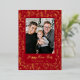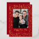 Tarjeta de Año Nuevo divertida con tu foto enmarcada en rojo con un fondo de retransmisores de Relieve metalizado dorado y confeti. La frase "Feliz Año Nuevo" se muestra en un guión de Relieve metalizado dorado con el nombre de tu familia y el año que se muestra a continuación. La tarjeta de Relieve metalizado de Año Nuevo se revierte para mostrar tu mensaje personal.