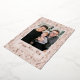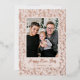 Tarjeta de Año Nuevo divertida con tu foto enmarcada en crema con un fondo de rodajas de Relieve metalizado de oro rosa y confeti. La frase "Feliz Año Nuevo" se muestra en un guión rosa de Relieve metalizado dorado con el nombre de su familia y el año que se muestra a continuación. La tarjeta de Relieve metalizado de Año Nuevo se revierte para mostrar tu mensaje personal.