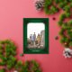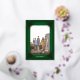 Su foto y nombre familiar están decorados con un elegante marco dorado sobre un fondo verde de un bosque de pinos. El fondo tiene rayas diagonales verdes y doradas con holly de oro. Foto: Photography © Storytree Studios, Stanford, CA.