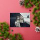 Tarjeta de vacaciones festiva con tu foto horizontal con "Sweater Weather" mostrada en un Relieve metalizado dorado sobrepuesto. Personalice la parte delantera de la tarjeta de vacaciones de Relieve metalizado con un saludo personalizado y su nombre. La parte posterior de la tarjeta presenta un patrón de suéter de copos de nieve nórdico verde y blanco.