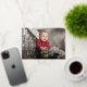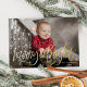 Tarjeta de fotografía navideña moderna con "Merry & Bright" mostrada en un guión de Relieve metalizado dorado con letras a mano sobre tu foto horizontal. Personalice la parte delantera del Relieve metalizado alegre y brillante con su nombre familiar y el año. La carta se revierte a un estampado festivo de estrellas rojas y blancas.
