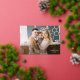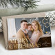 Elegante tarjeta navideña que muestra tu foto horizontal de sangre completa con "Feliz Navidad" con letras modernas de Relieve metalizado dorado. Personalice la parte delantera de la tarjeta de Navidades de Relieve metalizado de oro añadiendo su nombre y el año. La elegante tarjeta de vacaciones se invierte para mostrar un patrón de enrejado blanco contra un fondo verde oscuro o el color de su elección.