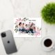 ¡Felices Fiestas! Tarjeta plana personalizable de fiestas con foil dorado que incluye ilustración en acuarela de poinsettias rosadas, bayas, algodón y acebos. Personalice añadiendo fotos y su propio texto. Esta tarjeta de fiestas floral rosa está disponible en una variedad de cartulinas. Envíe saludos de fiestas a familiares y amigos con esta bonita tarjeta botánica rosa de fiestas.