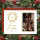 The back continues the festive theme with a coordinating faux gold tone seamless holly and berries pattern on dark red, adding polish and seasonal style. Fully customizable text and photo options make this design perfect for sharing warm Christmas greetings with family, friends, and loved ones.