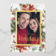 Tarjeta de vacaciones de Relieve metalizado con guión gráfico. Esta elegante tarjeta fotográfica Holiday presenta un hermoso marco de vegetación acuática pintada a mano, flores y bayas con un marco dorado real y un guión elegante. La parte posterior incluye la misma ilustración con una segunda foto y texto para personalizar su mensaje. Buscar elementos coincidentes en la colección de Navidades de Poinsettia de vacaciones.