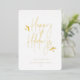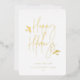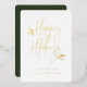 Felices fiestas, guión simplemente festivo con acentos de follaje, tipografía de pan de oro real. Foto de marco cuadrado único con espacio de plantilla para su mensaje personal de vacaciones en la parte posterior con fondo verde oscuro.