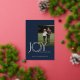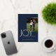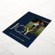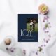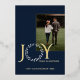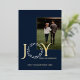 Elegante Relieve metalizado dorado, "Alegría, paz, felicidad", festividad era saludo de foto en azul y oro. La palabra Alegría tiene una corona para la letra O y esta hoja de bonito continúa hacia la parte posterior de la tarjeta como marco para una foto adicional.