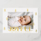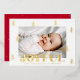 Festividad de la tarjeta de Navidades fotográficos con su foto horizontal rodeada de pinos de Relieve metalizado dorado de fondo blanco. "Alegre" se muestra en negrita con letras de Relieve metalizado dorado con el saludo de su personalizado y el apellido que se muestra a continuación. La alegre tarjeta de Navidades se revierte para mostrar una foto adicional y un fondo rojo con sutiles puntos blancos.