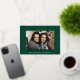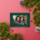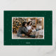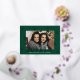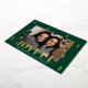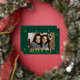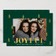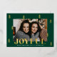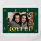 Festividad de la tarjeta de Navidades fotográficos con su foto horizontal rodeada de pinos de Relieve metalizado dorado de fondo verde. "Alegre" se muestra en negrita con letras de Relieve metalizado dorado con el saludo de su personalizado y el apellido que se muestra a continuación. La alegre tarjeta de Navidades se revierte para mostrar una foto adicional y un fondo verde fresco con sutiles puntos blancos.